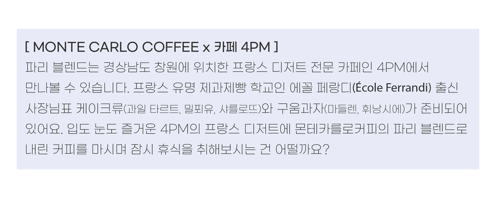 · 몬테카를로커피의 로스팅 요일은 화요일과 금요일입니다.